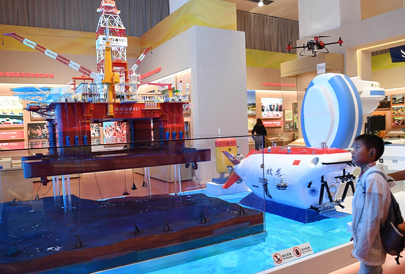 观众在“复兴之路”大型主题展览上参观“海洋石油981”钻井平台模型(2018年7月3日摄)。新华社记者 金良快 摄