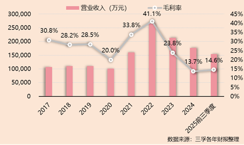 然而,行业的盛宴在2022年后戛然而止。随着上游产能释放与下游需求增速放缓,有机硅产业链步入下行通道。三孚股份的运营数据清晰地反映了这一周期性冲击:2023年营收回落至21.29亿元,毛利率骤降至23.83%;至2024年,营收进一步收缩至17.70亿元,毛利率仅余13.72%。这一变化的核心在于其硅系列业务的表现逆转,该业务收入在2024年大幅下滑至4.10亿元,毛利率仅为12.28%,与两年前的巅峰状态形成鲜明对比。