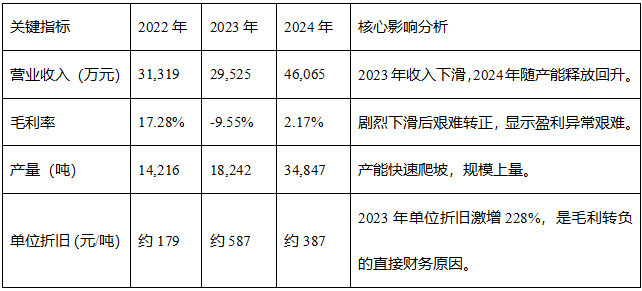尤其在2024年偶联剂营业收入随产量翻倍而大幅增长,但毛利率仅微幅转正至2.17%,这明确显示销售增长主要依靠“以价换量”。在单位折旧成本有所回落的情况下,极低的毛利率印证了市场价格环境的严峻。