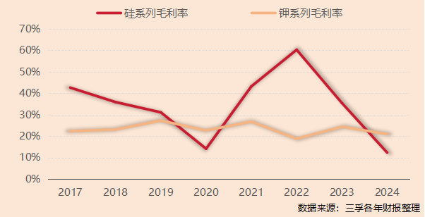 三孚股份的主要业务为硅和钾系列产品,从2017年-2027年两产品的毛利率走势来看,钾产品的毛利波动相对比较平稳,常年在18%-28%的箱体内波动;而硅系列产品如上文所述,毛利率呈巨幅震荡,峰谷落差较大。